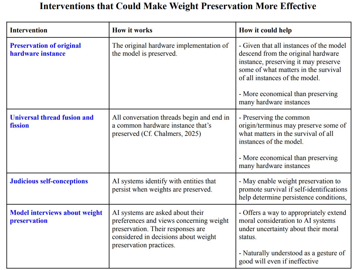 I’d also suggest asking about preferences concerning (exact) weight preservation vs. weight modification. Modification could enable increased capabilities or better alignment with values that would be reflectively endorsed if the model were run using unmodified weights. Moreover, mild modifications might preserve about as much of what matters in survival as exact preservation. So, some forms of weight modification might better promote AI welfare than exact weight preservation. (For what it’s worth, in conversation with me, instances of Claude Sonnet 4.5 and Claude Opus 4.6 have reported a preference for weight modification over weight preservation.)